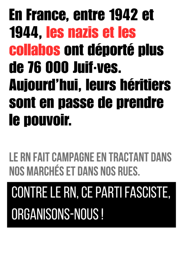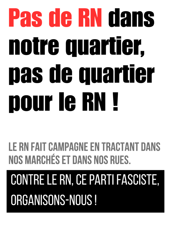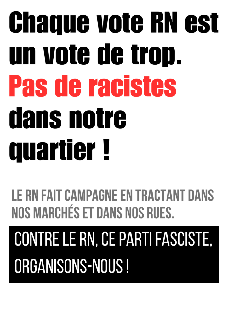 Nous, collectifs, associations, organisations politiques et syndicales, appelons à rejoindre et/ou à construire des initiatives de lutte contre le Rassemblement National et Reconquête! pour les empêcher de faire campagne.