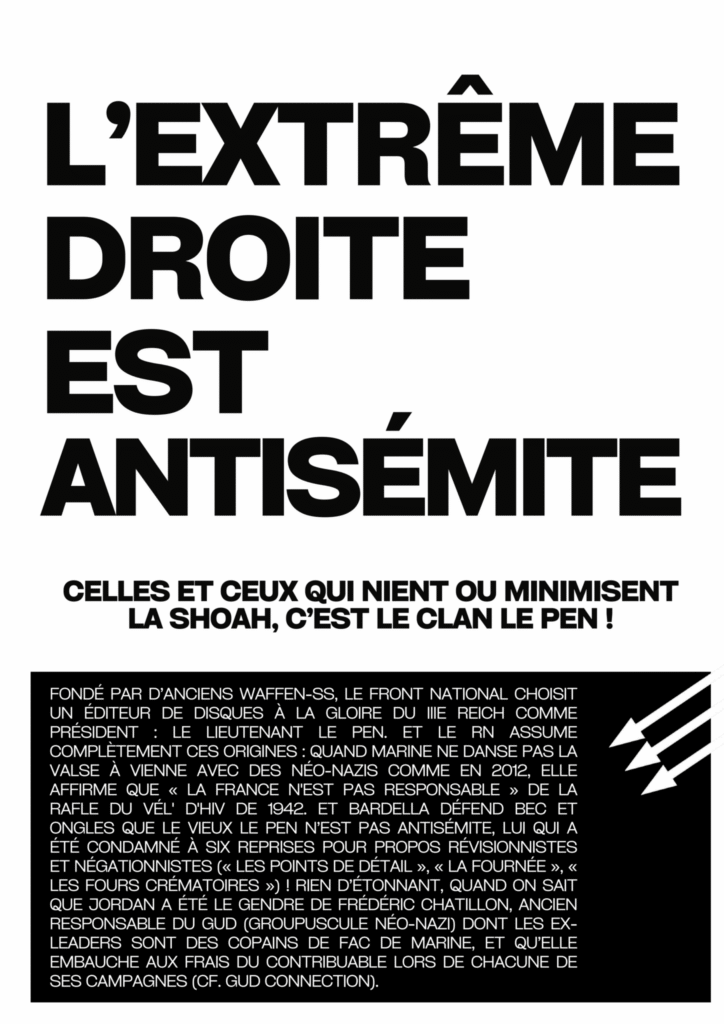 Nous sommes en train de mettre en place une plateforme sur laquelle on peut mettre des brochures, des tracts et des methodes pour que n’importe qui, n’importe où, puisse recouvrir chaque sticker et chaque affiche des candidat-e-s de ce parti, être présent-e-s à chaque tractage et à chaque meeting pour rappeler que nos villes et nos villages sont et resterons antifascistes et antiracistes.