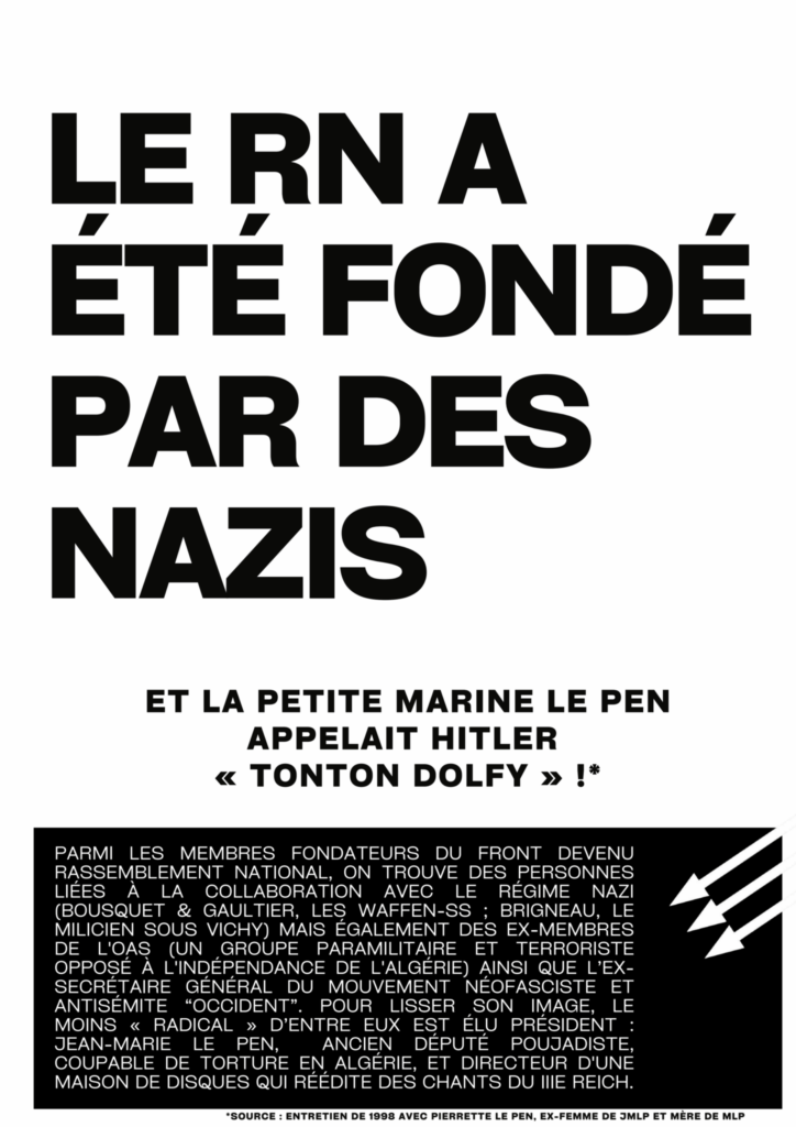 Le FN a été fondé par des collaborationistes, des Waffen SS et des nostalgiques de l’Algérie française dont des membres de l’OAS. Le RN est toujours un parti fasciste qui doit faire l’objet d’une lutte spécifique. Il défend la « préférence nationale » tout en s’appuyant sur les offensives xénophobes du gouvernement et de la droite.