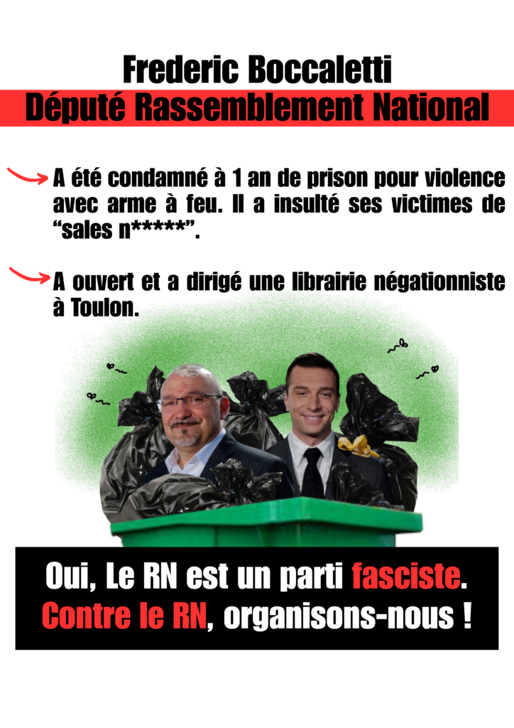 A chaque fois que le RN a pris le pouvoir, ça a représenté un tournant fasciste. Ils ont mis à execution leur programme raciste. Le maire RN du Luc dans le Vaucluse a menacé physiquement des associations de sa ville, a fait adopter une charte « Ma Commune sans Migrants » et a envoyé des lettres racistes à ses habitant.es.